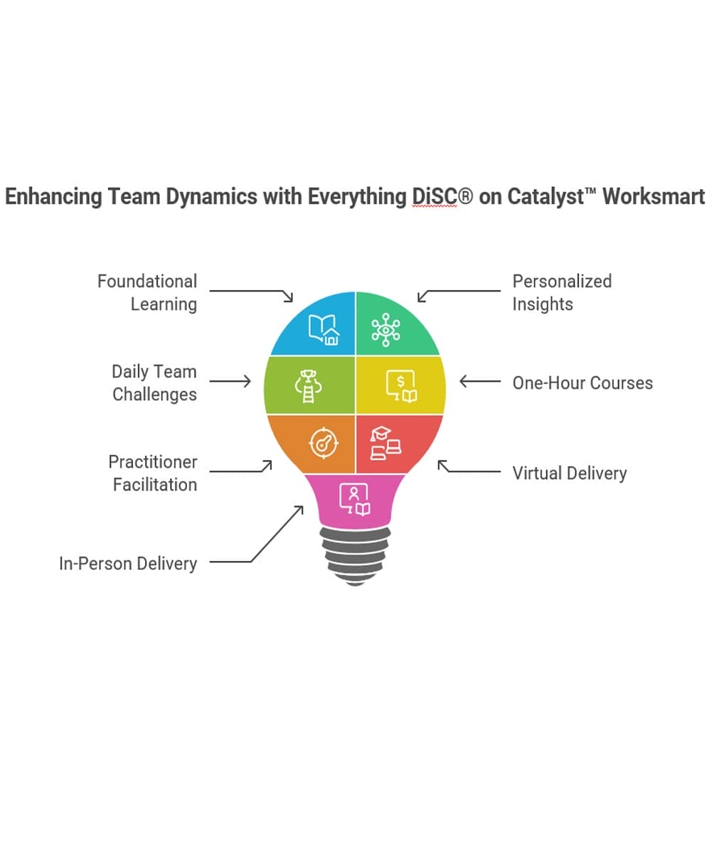 Everything DiSC® on Catalyst™ is an interactive learning platform that combines personalized DiSC assessments with ongoing development tools. Allowing users to return and learn when needed, they can access their results, explore team dynamics, and apply DiSC strategies in real time. The Catalyst platform makes training more engaging with practical resources that support collaboration, leadership, and workplace culture improvement.
